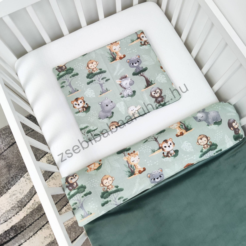 Deluxe Baby 2 részes babaágynemű garnitúra - takaró + párna - zöld bársony - szafari kölykök